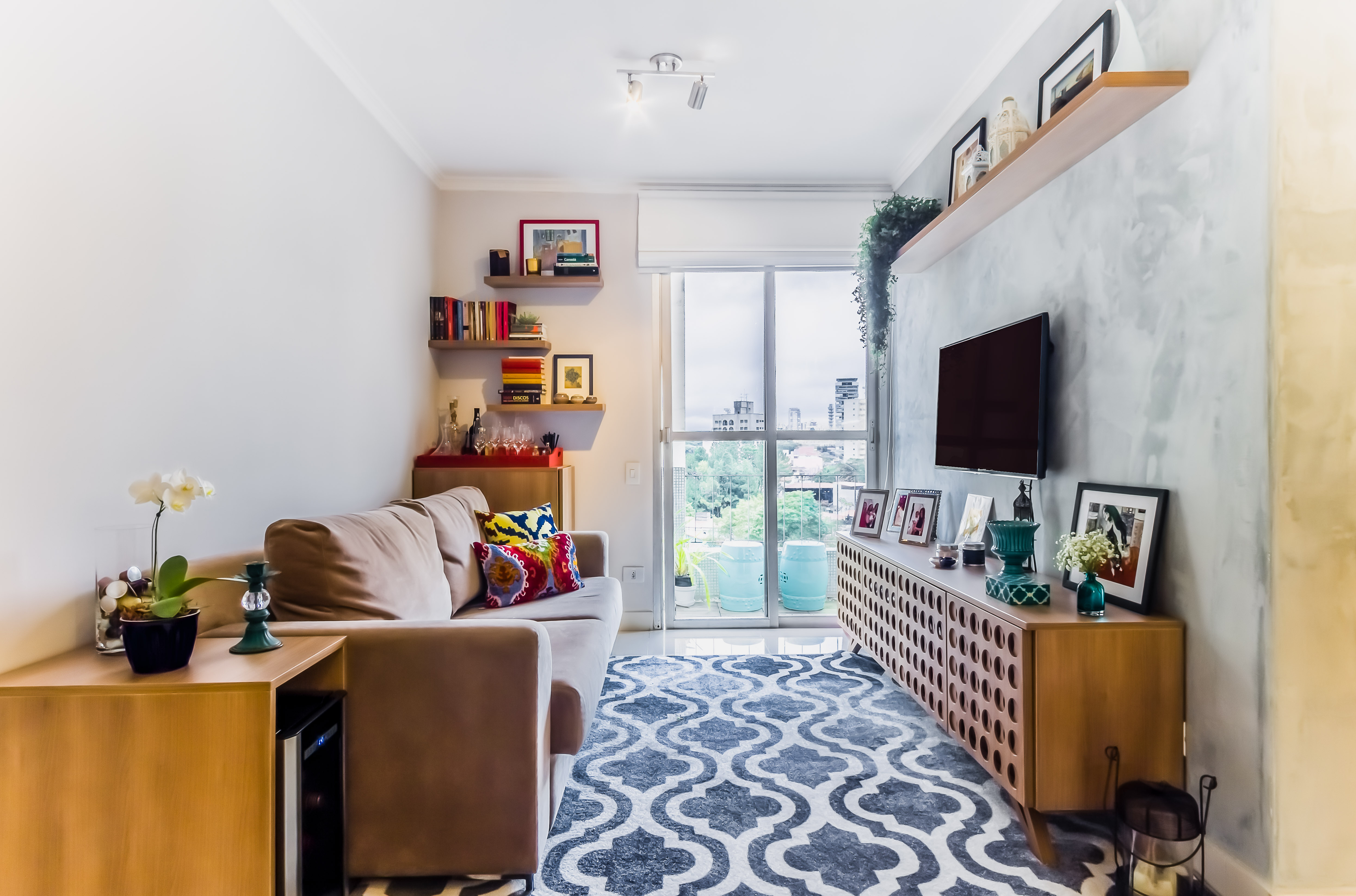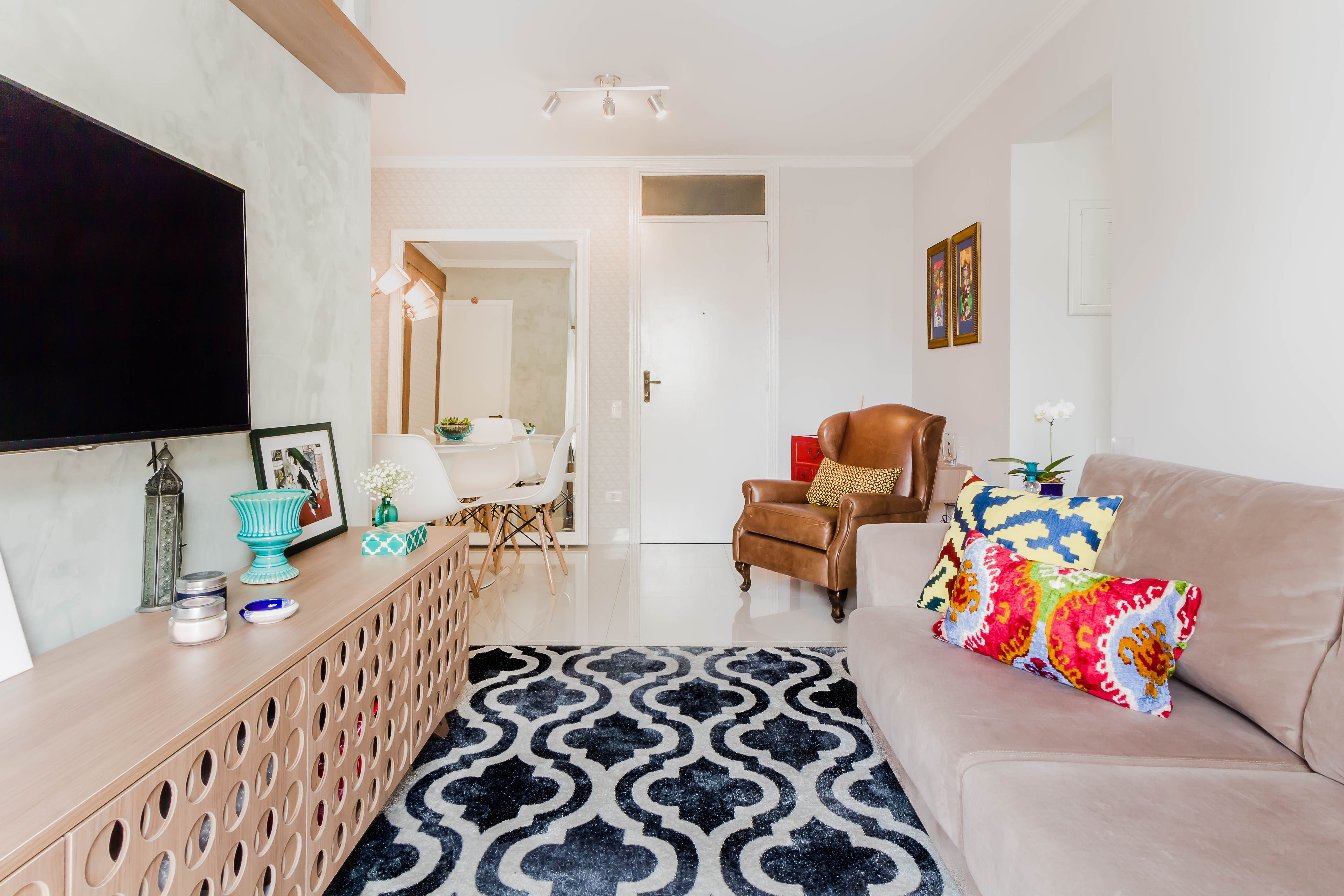 Neste apartamento brincamos com as texturas, papel de parede, cimento queimado, porcelanato e madeira. Para aproveitar o espaço trocamos a porta de abrir por uma de correr, onde instalamos o mesmo papel de parede que na Sala de Jantar.